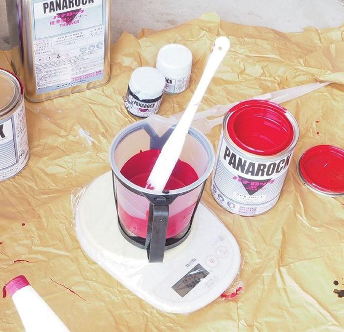 調合する手順は、塗装に必要な量のカラー塗料を充分攪拌したあとに、硬化剤を混ぜ、さらに攪拌します。