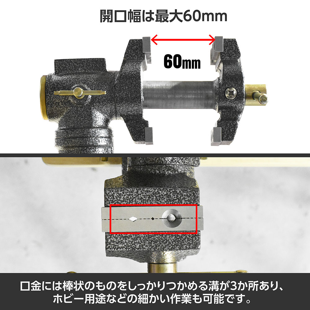 水平、垂直方向に360°回転するので、加工物の向きや角度を自在に変えて固定できます。
