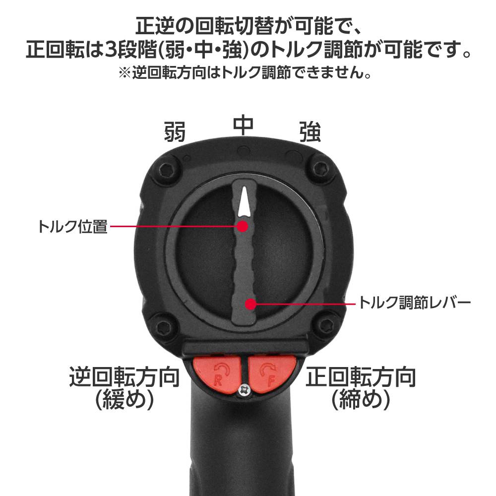 正逆の回転切替が可能で、正回転は3段階のトルク調節が可能です。