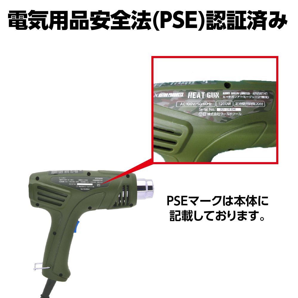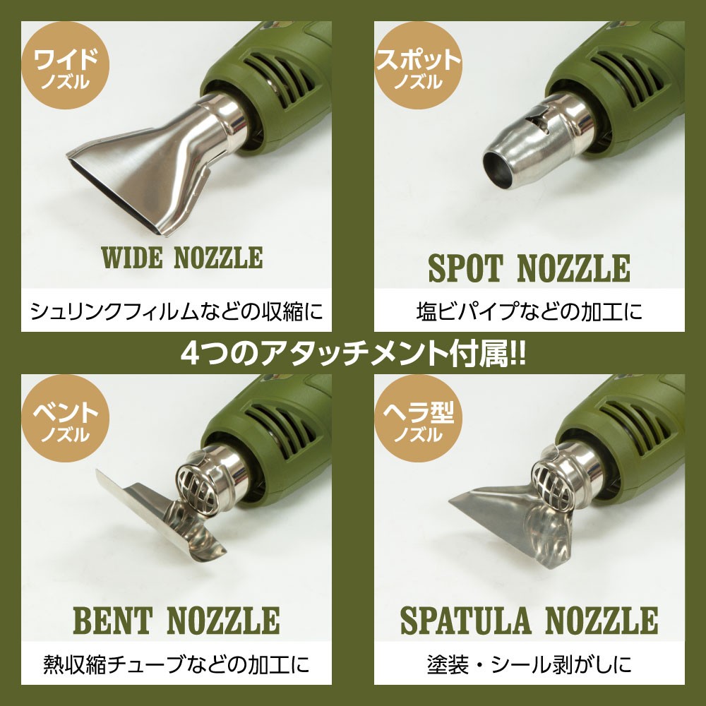 付属ノズル | ワイドノズル、スポットノズル、ベントノズル、ヘラ型ノズル | PSEマーク取得済 (届出事業者名:株式会社ワールドツール) |