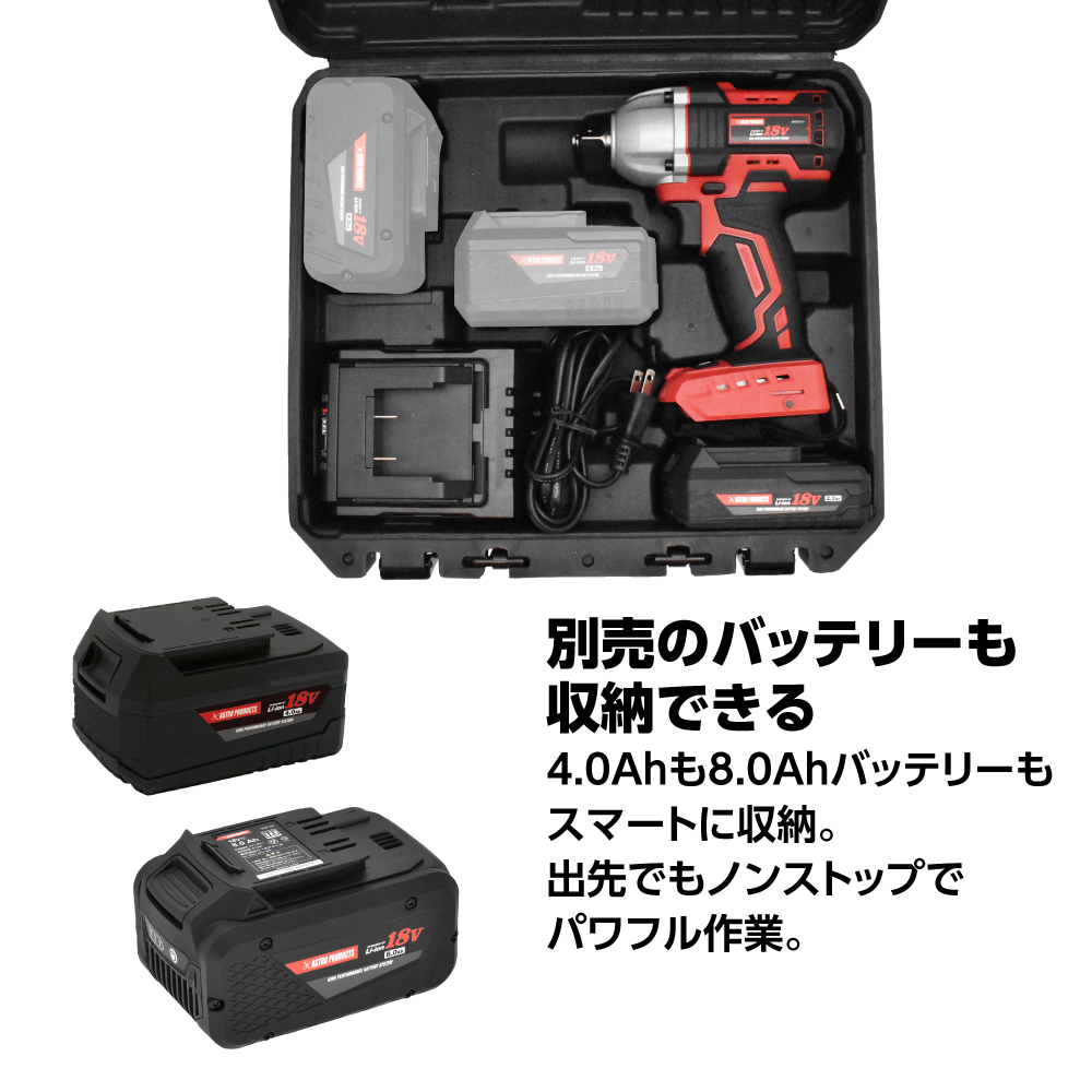 収納に便利なケース付きで、別売りの4.0Ah、8.0Ahバッテリーも収納することができます。