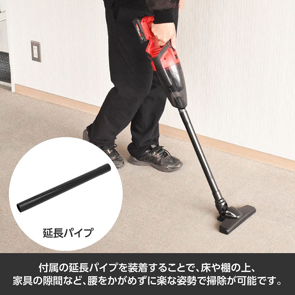清掃する場所にあわせて使える、3種類のノズルと延長パイプを付属しています。