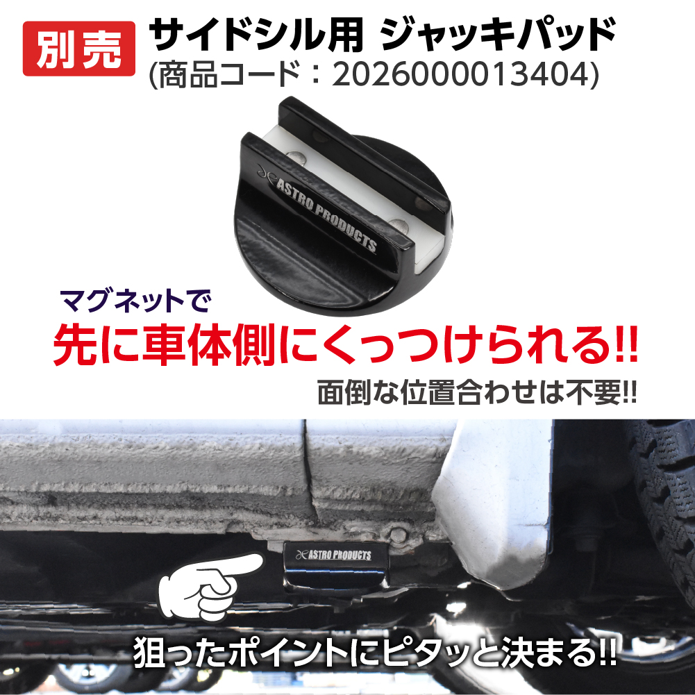 ※ジャッキアップしたまま車両を支える目的で作られていないため、ジャッキアップ後に下降することがあり大変危険です。必ずリジッドラックで車両を支えてください。