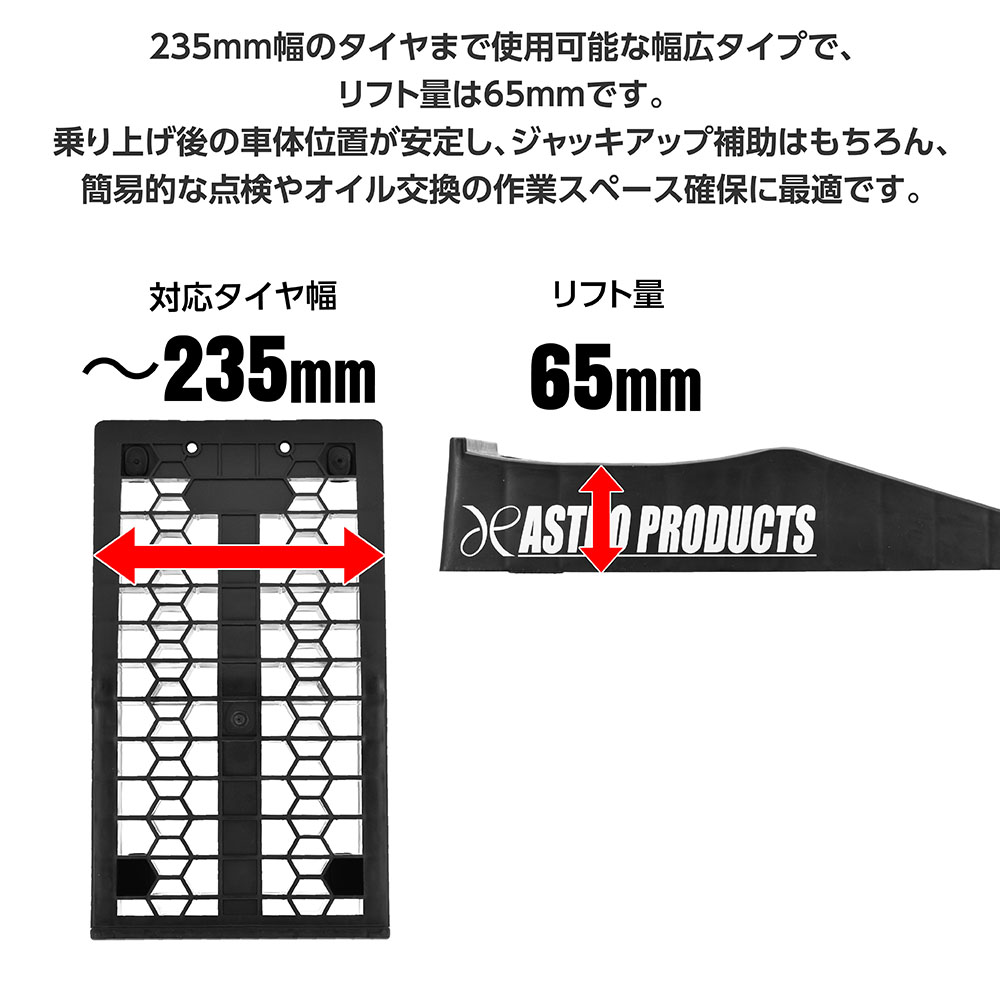 235mm幅のタイヤまで使用可能な幅広タイプで、リフト量は65mmです。