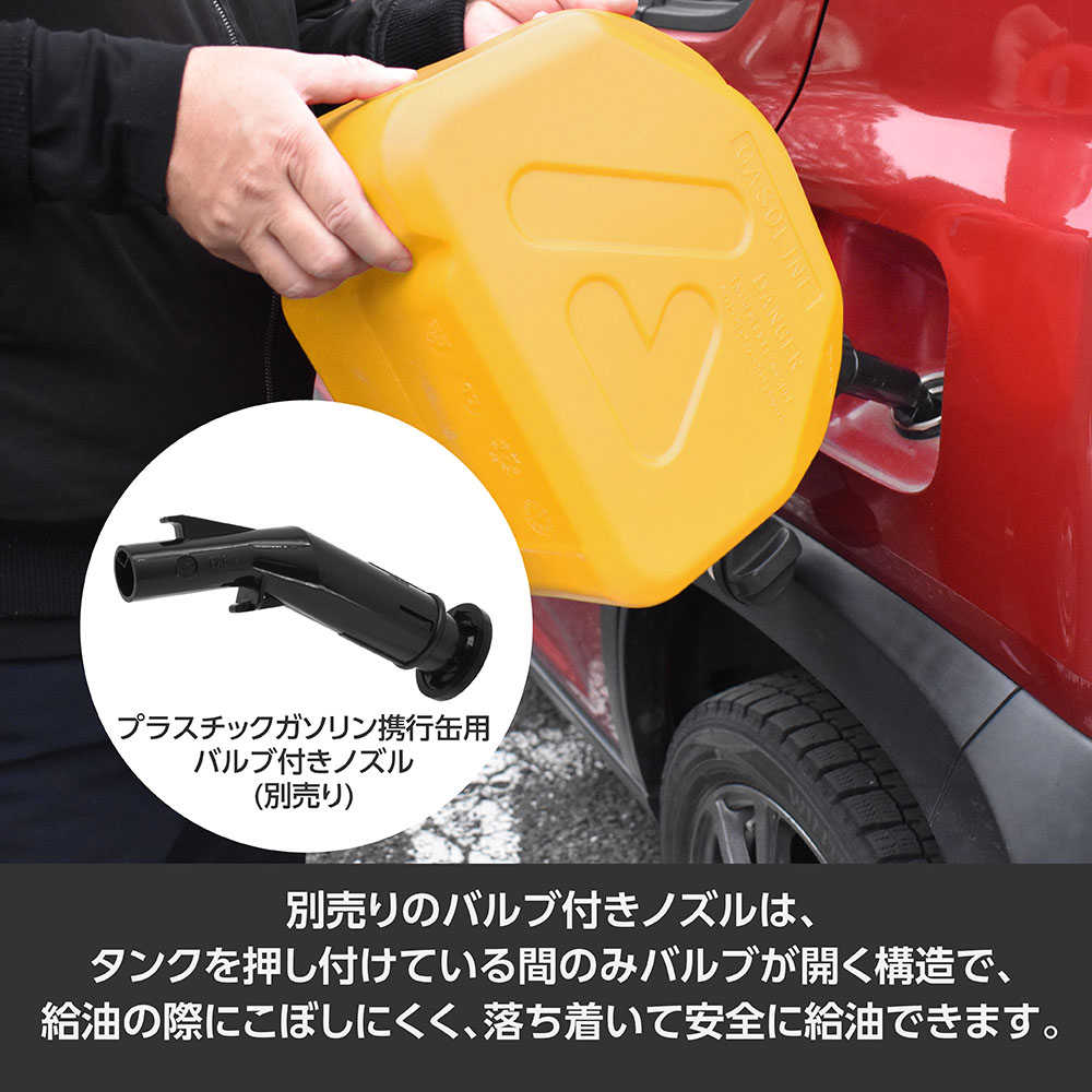 別売のバルブ付きノズルは、タンクを押し付けている間のみバルブが開く構造で、給油の際にこぼしにくく、落ち着いて安全に給油できます。