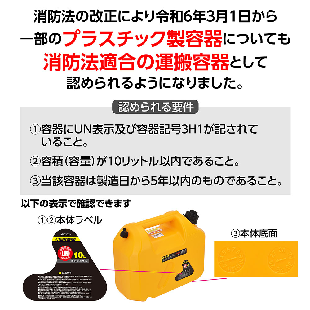 ※法令において、製造から5年以上経過した携行缶は、危険物運搬容器として使用できません。本体の製造刻印を元に、使用者が管理してください。