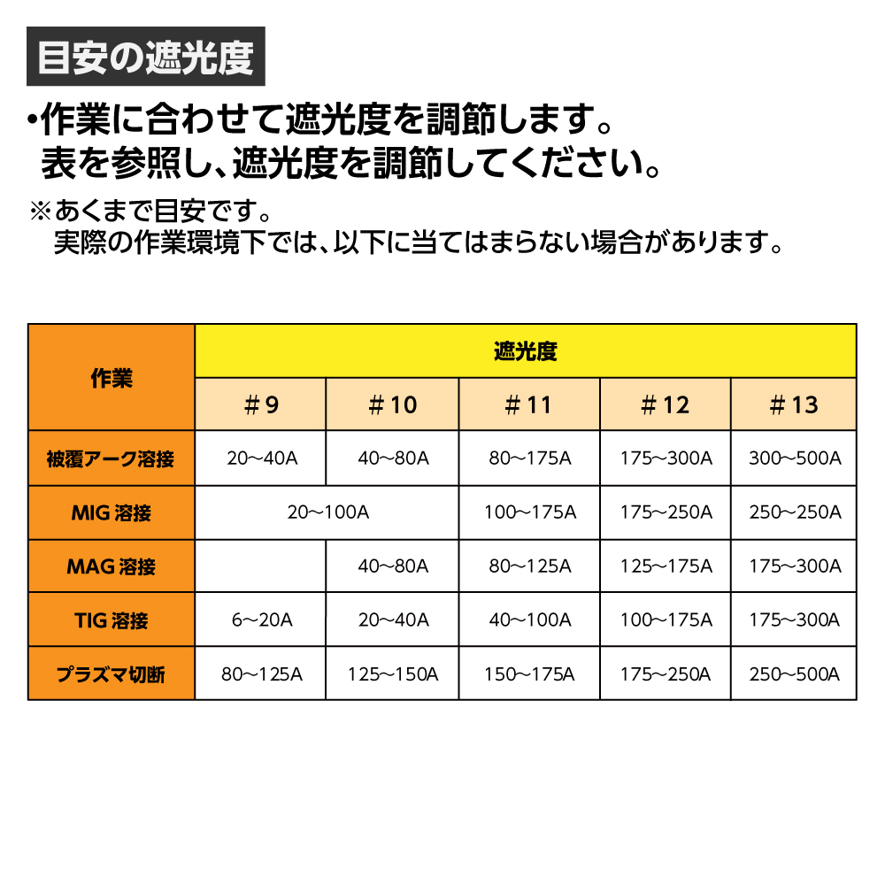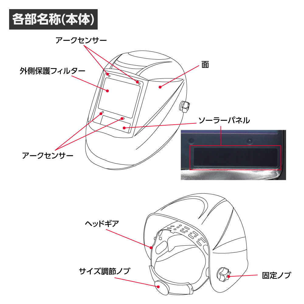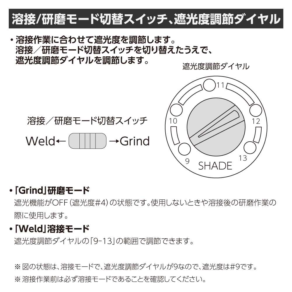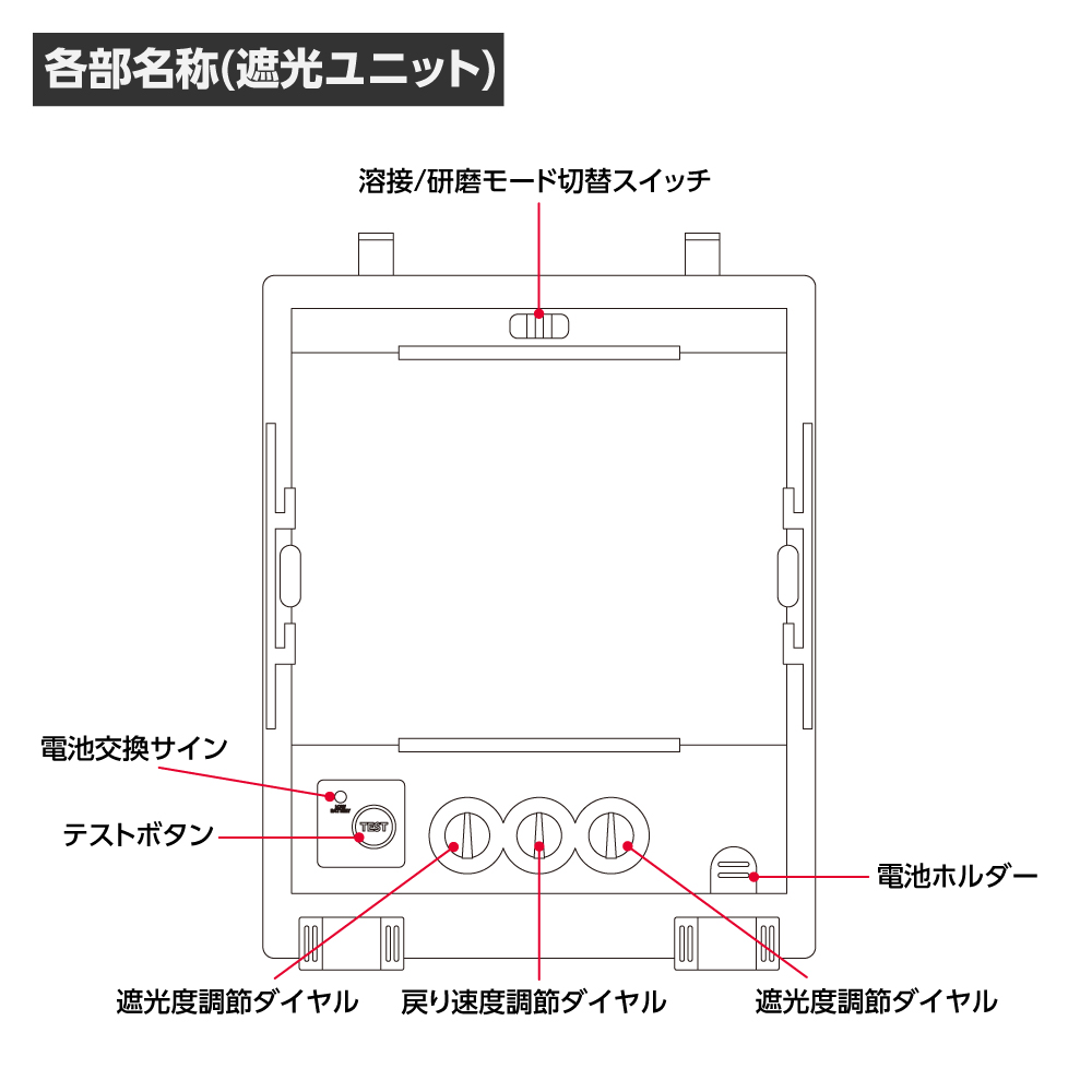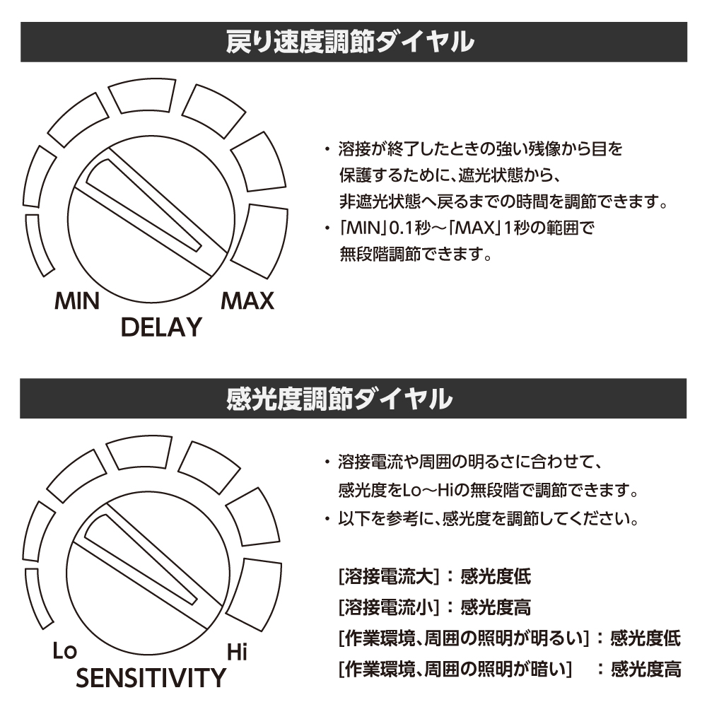 | 機能 | 遮光度調節、無段階感光度調節(Lo~Hi)、無段階戻り速度調節(遮光→非遮光)0.1~1秒、作動チェックボタン、溶接/研磨モード切替/電池交換サイン |