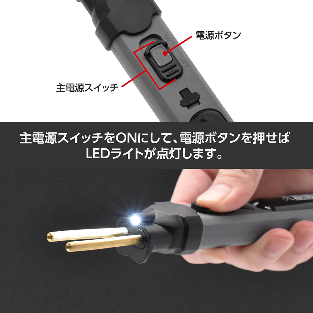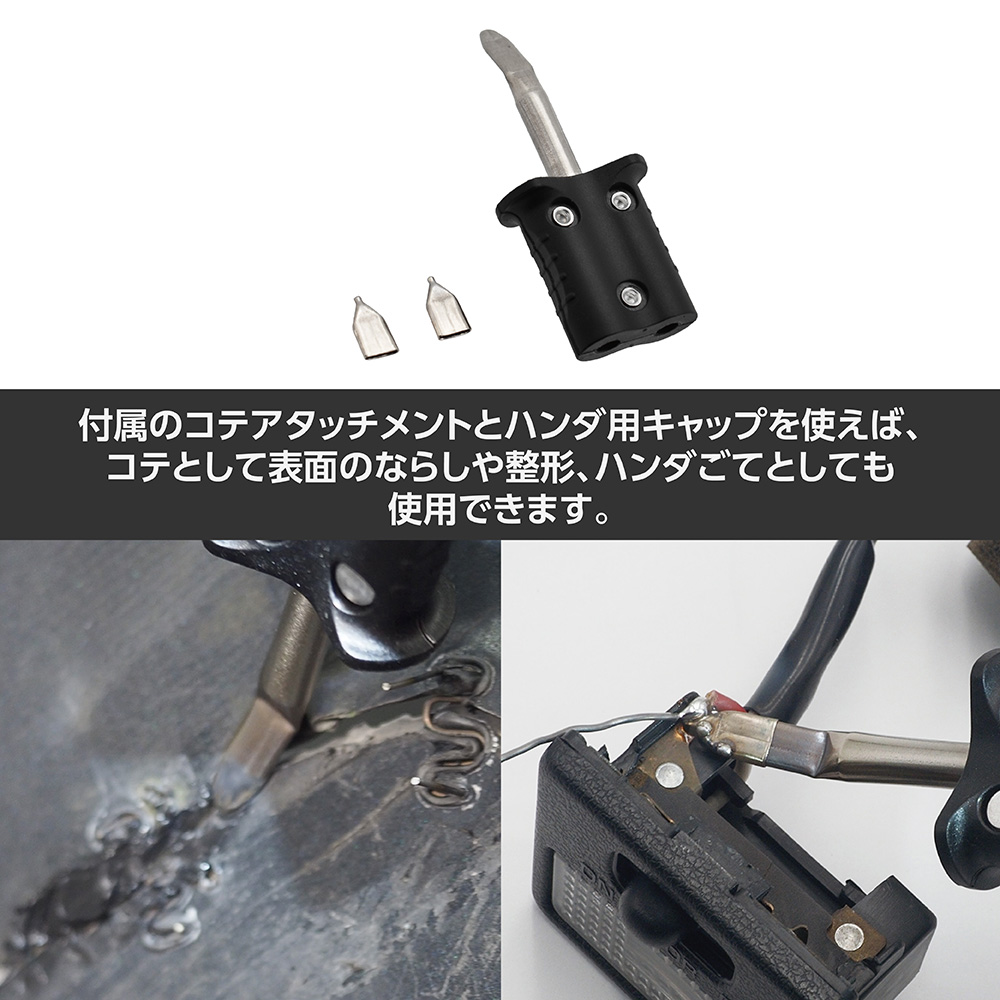 ハンダ用キャップが付属し、ハンダこてとしても使用できるので、電源のない出先での作業や車内の配線作業にも重宝します。