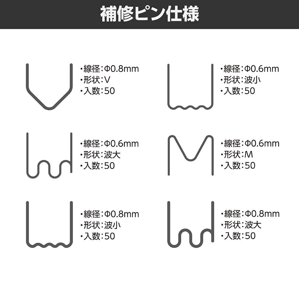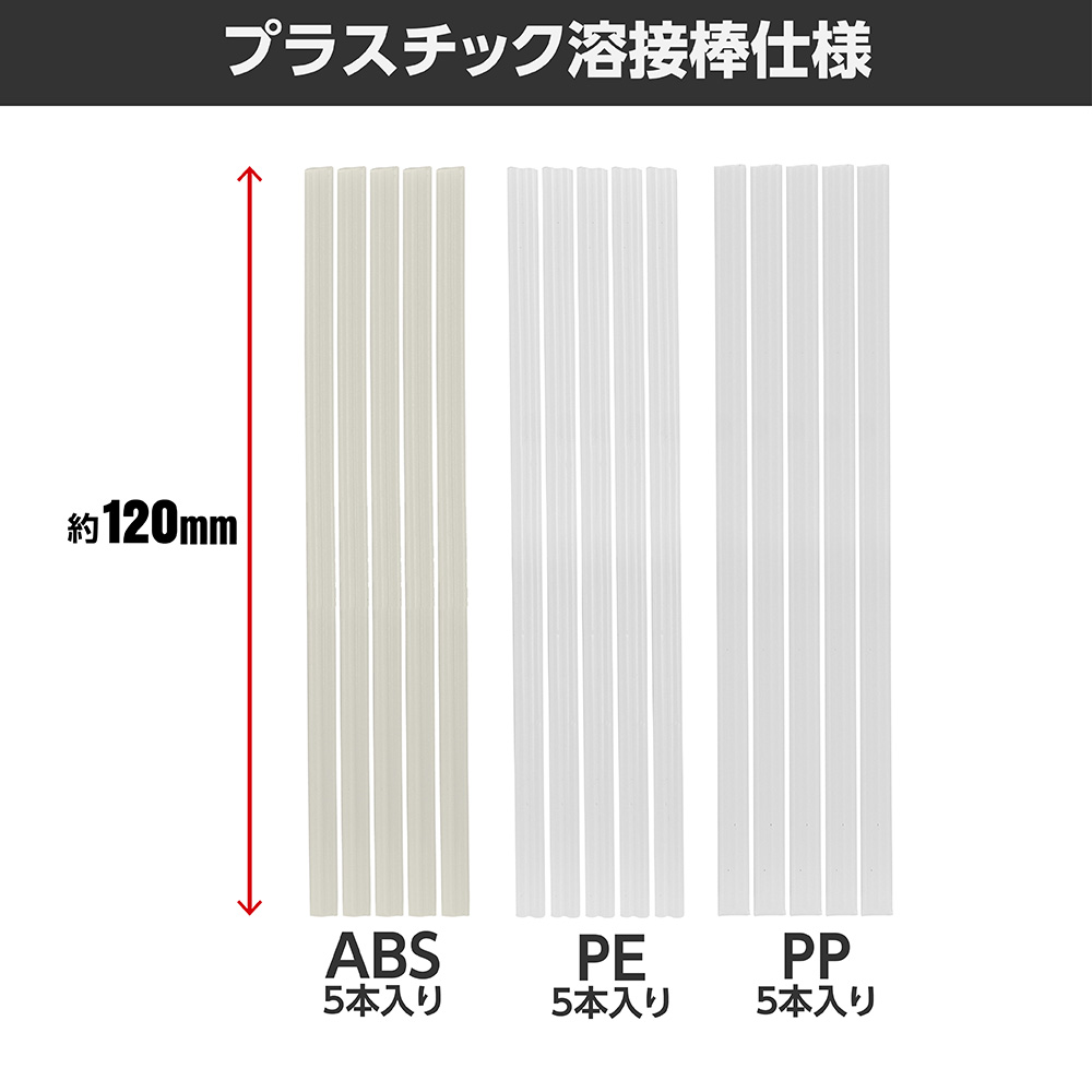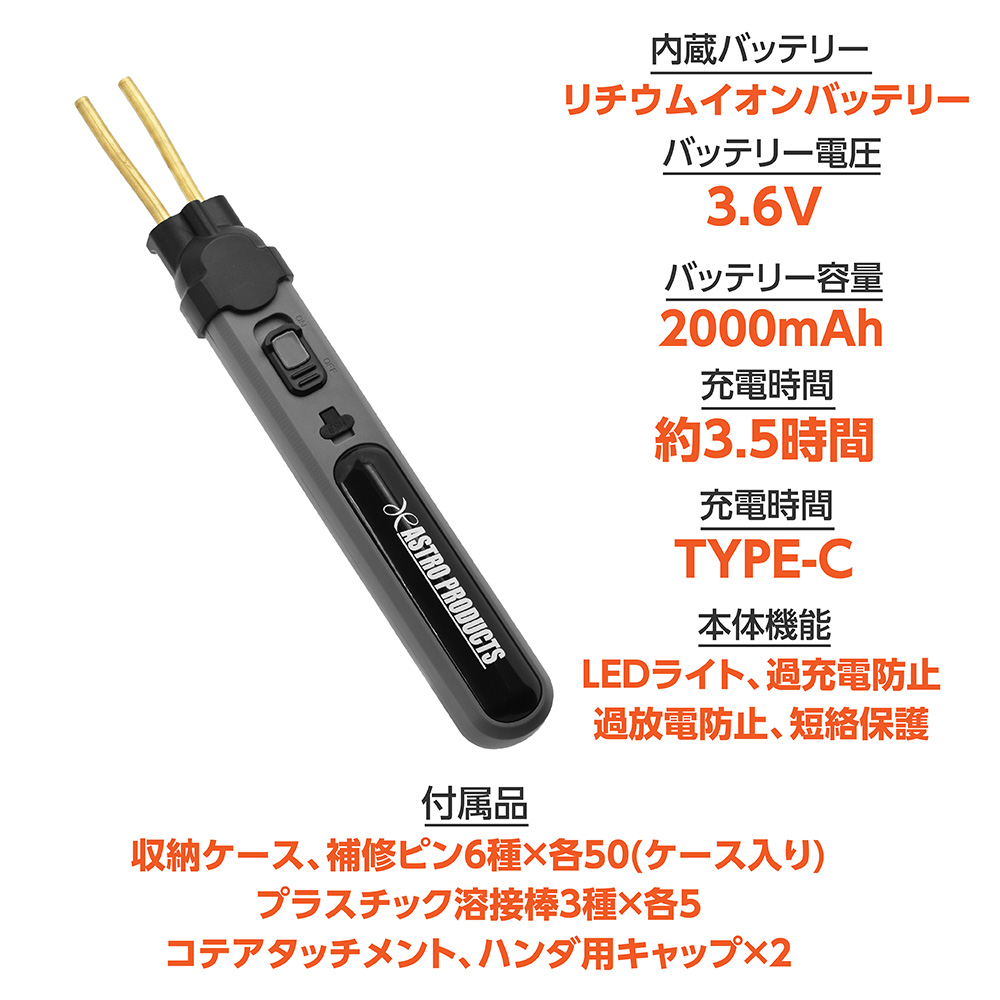 | 付属品 | 収納ケース、補修ピン6種×各50(ケース入り)、プラスチック溶接棒3種×各5、コテアタッチメント、ハンダ用キャップ×2 |