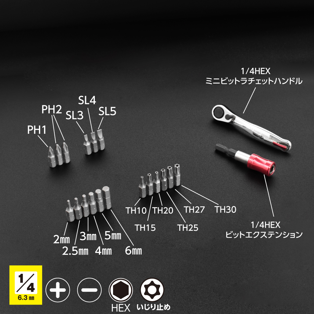 AP ビット:PH1、PH2×2個、SL3、4、5、HEX 2、2.5、3、4、5、6mm | ||