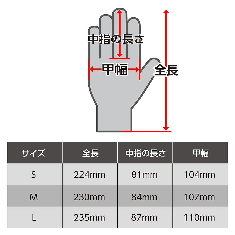 | サイズ | 全長 | 中指の長さ | 甲幅 |
