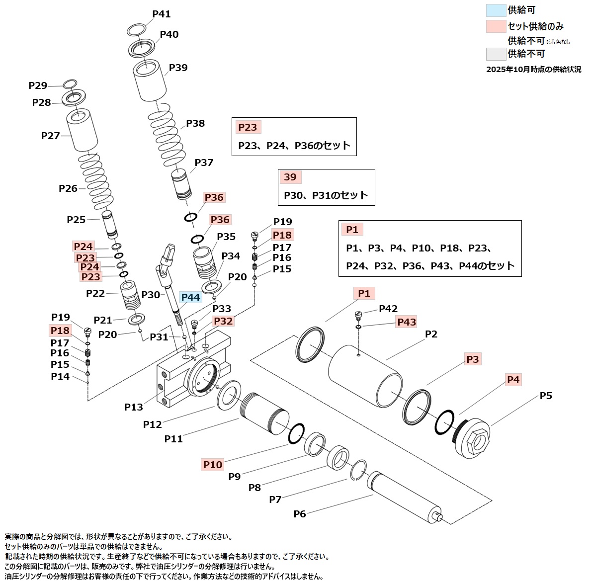 | P01 | 油圧シリンダーオイルシールキット | P1、P3、P4、P10、P18(2個)、P23(2個)、P24(2個)、P32、P36(2個)、P43、P44のセット |