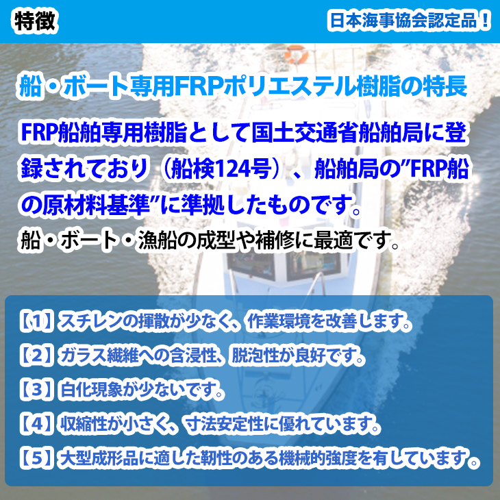 FRP船舶専用樹脂として国土交通省船舶局に登録されており(船検124号)、船舶局の”FRP船の原材料基準”に準拠したものです。