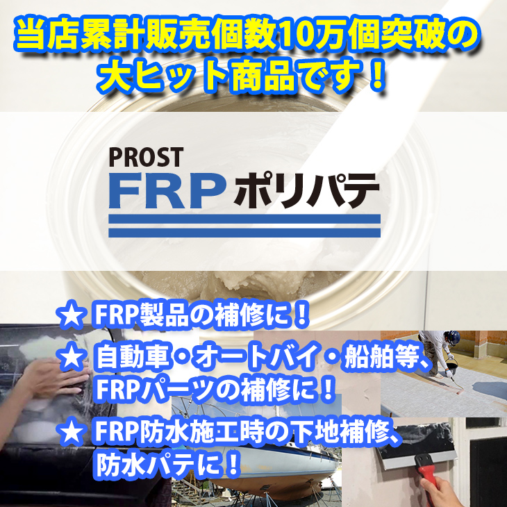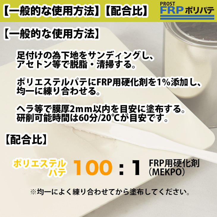 ※別途、FRP用硬化剤が必要です。ポリエステルパテに対して1%を添加して使用してください。
