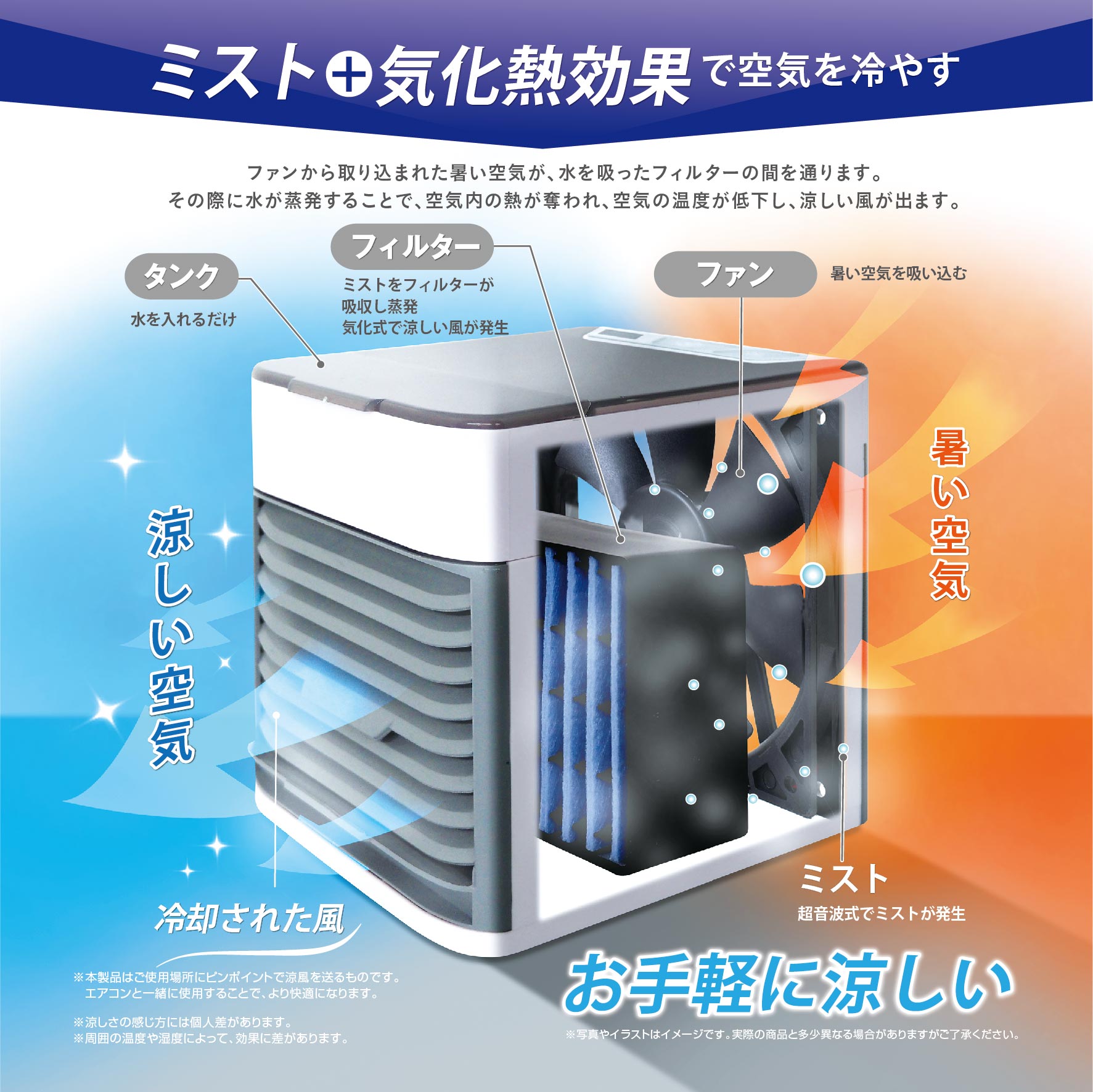 水だけですぐに涼しくなる、持ち運び可能な卓上クーラーです。