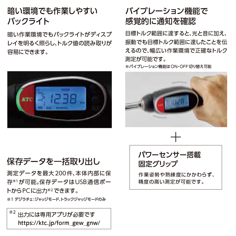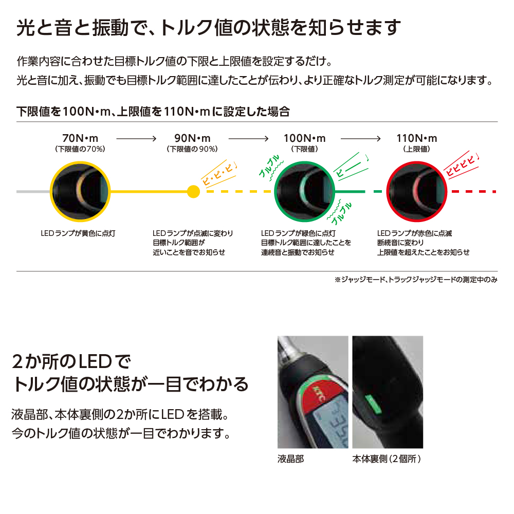 目標トルクへの到達を音や光に加え、振動により報知するため作業性に優れます。
