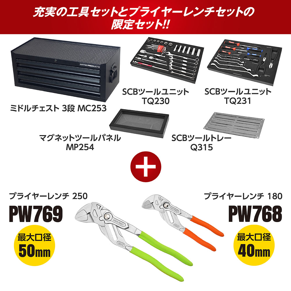 ミドルチェストとSCBツールユニット TQ230とTQ231 、マグネットツールパネル、ツールトレーが1つになったベーシックセットです。